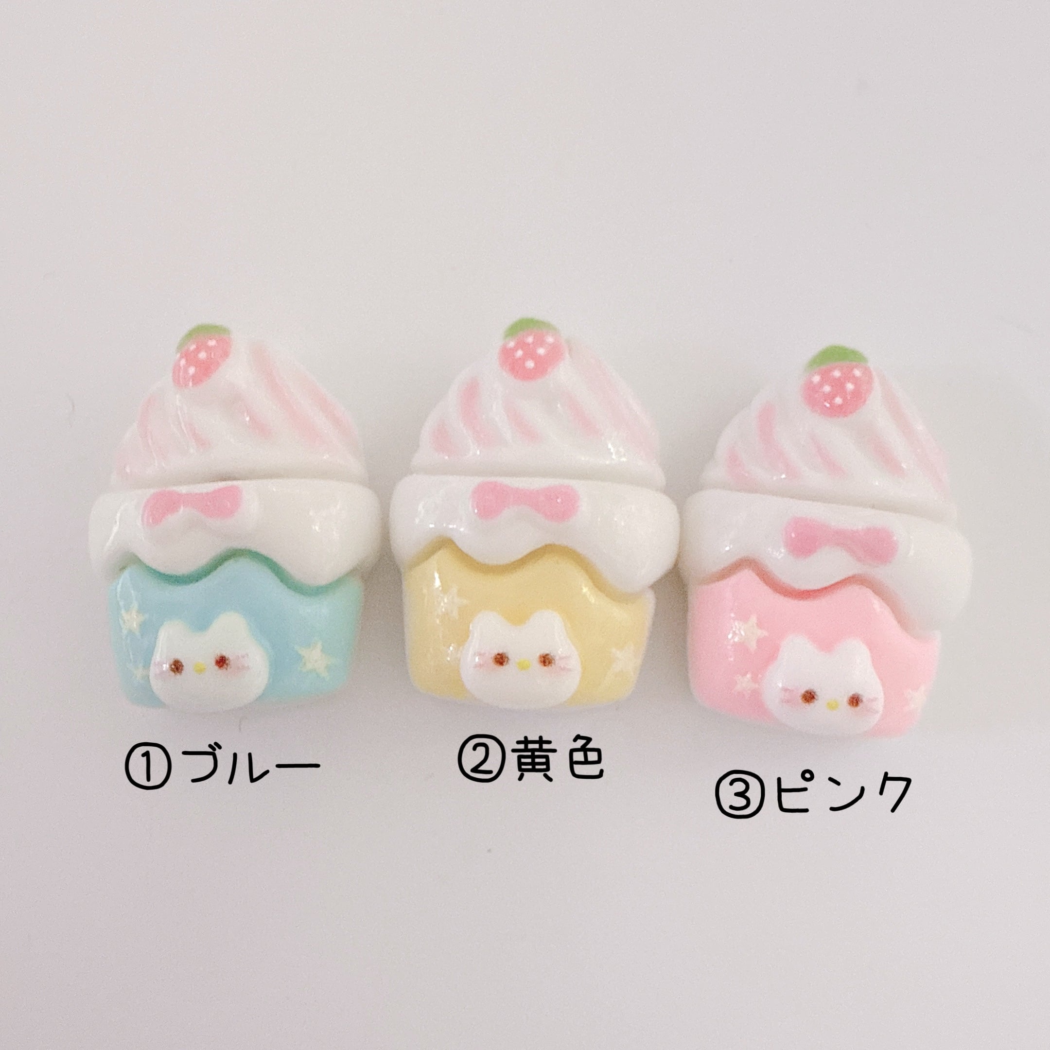 C124)2個 ねこちゃんのいちごパフェ デコパーツ パステルカラー 黄色 ピンク ブルー 白