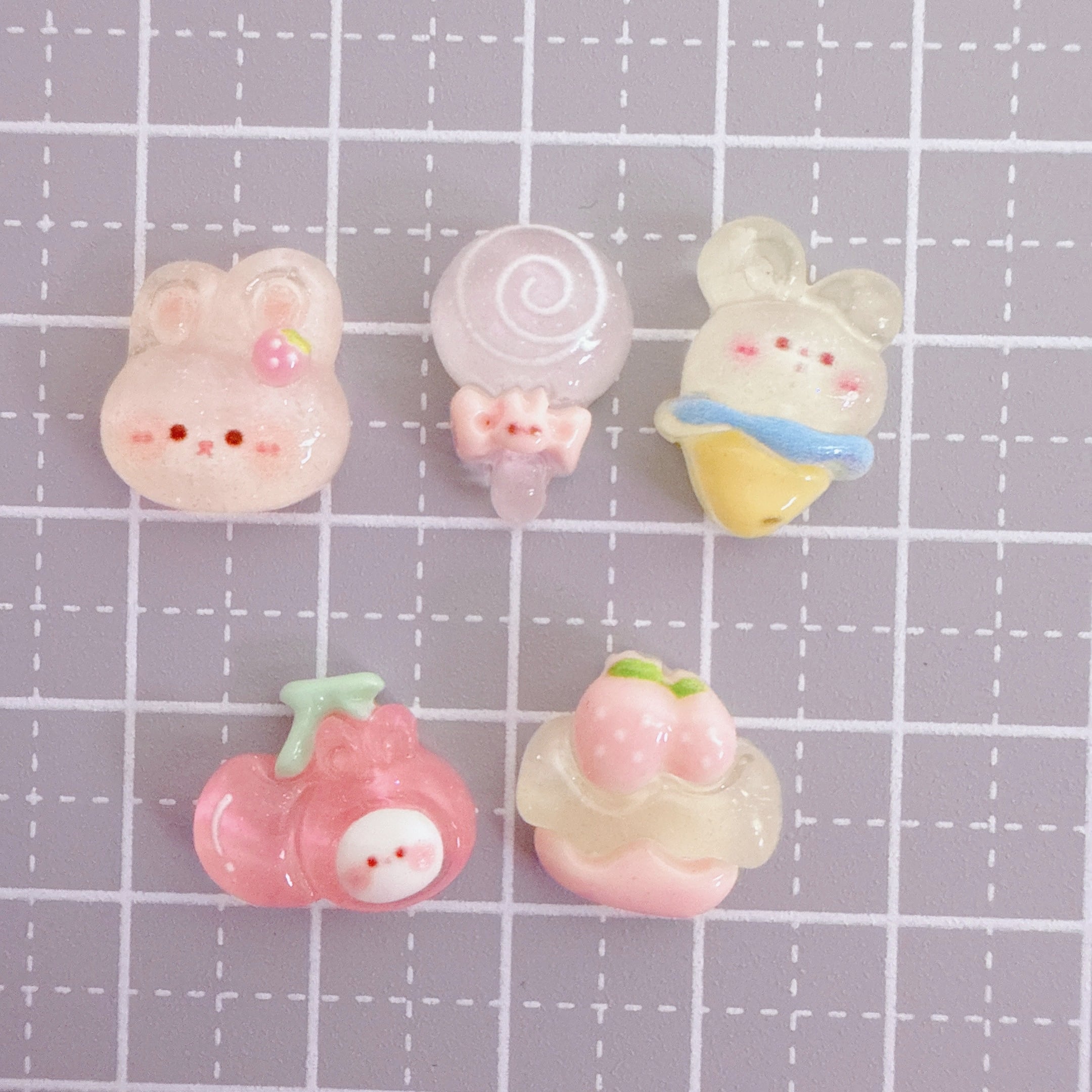 D86)4個 ミニサイズランダム うさちゃん&スイーツ 小さなパーツ さくらんぼ いちごケーキ レジン カボション 模造食品