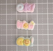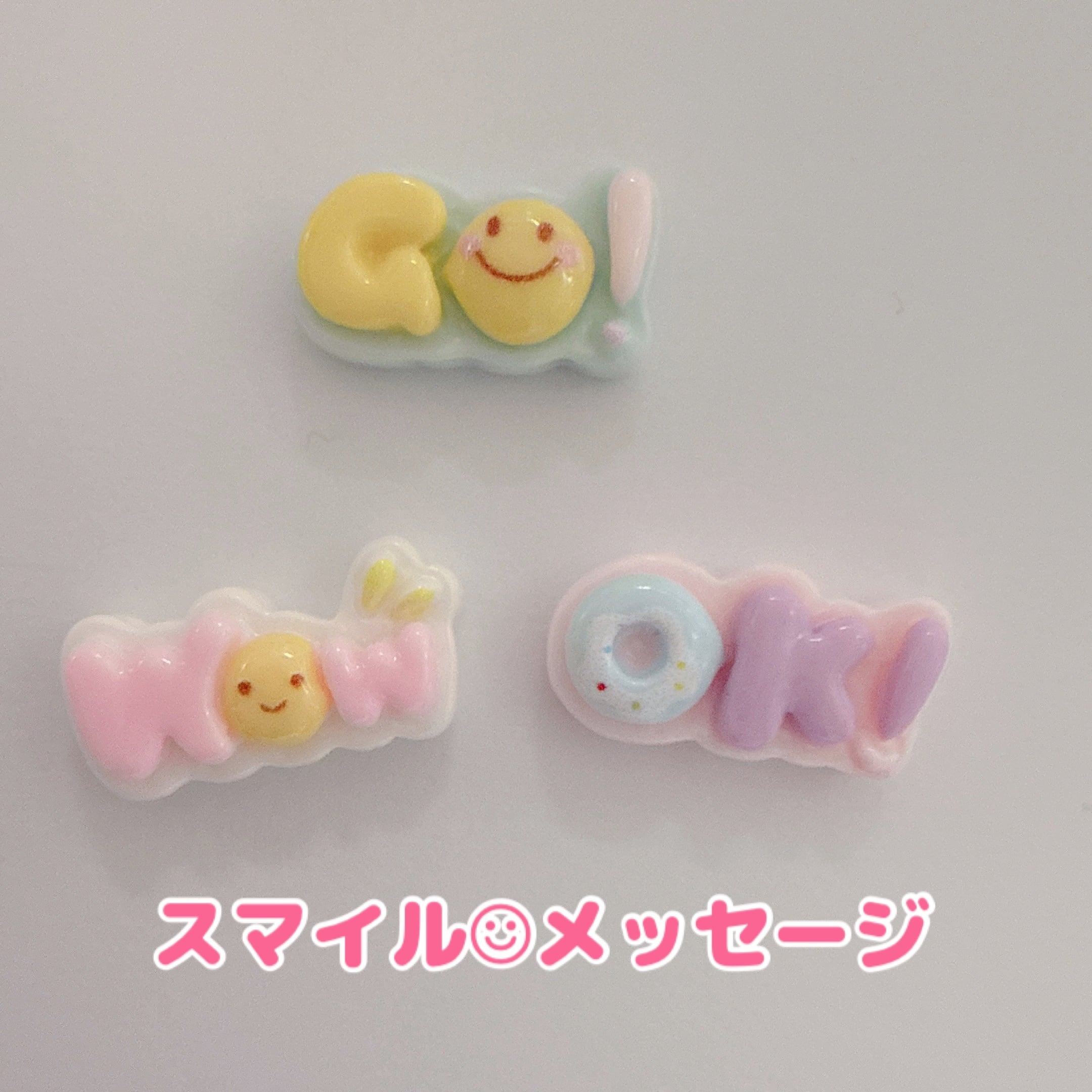 D89)3個 同色3 ミニサイズ メッセージ 二コちゃん スマイル GO! WOW OK! 小さなパーツ レジン カボション 模造食品