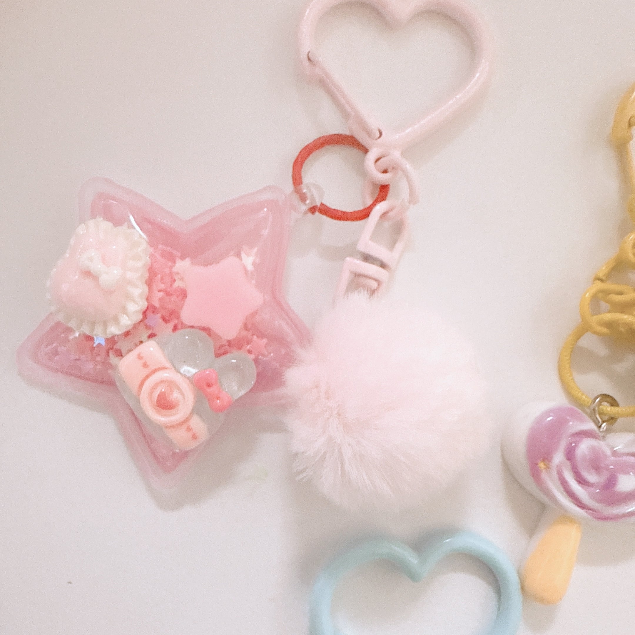 ハートのかわいいキーホルダーにふわふわのポンポンが付いています。