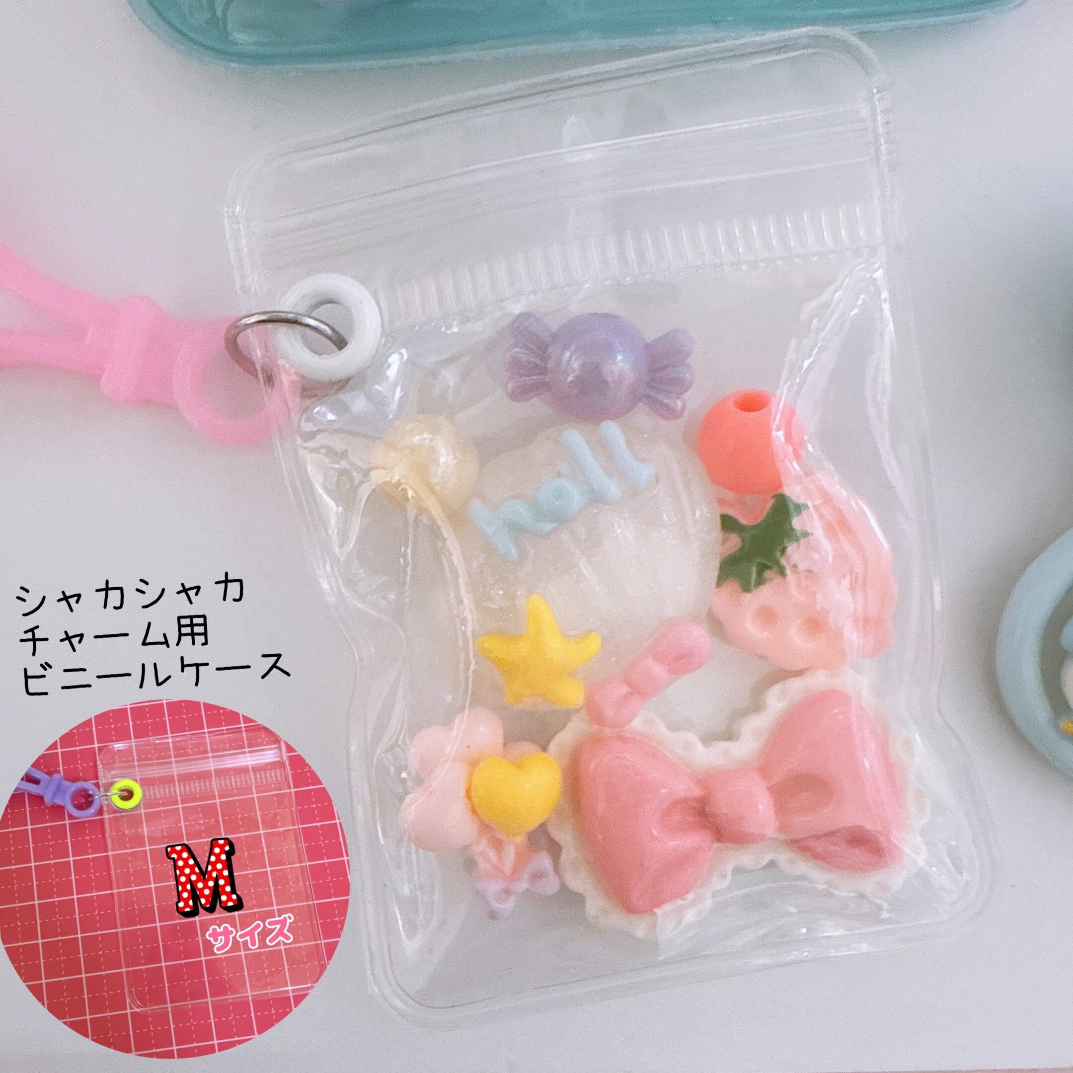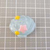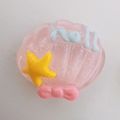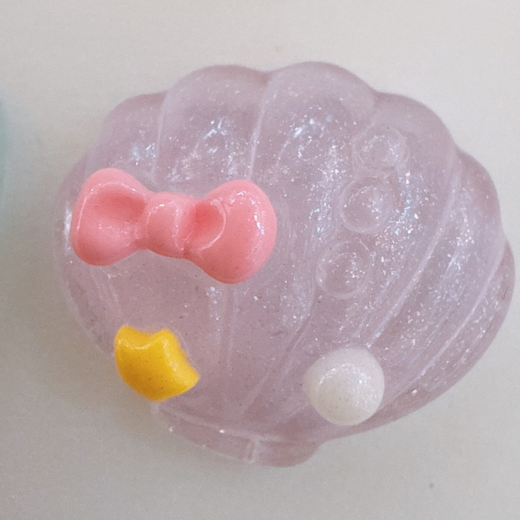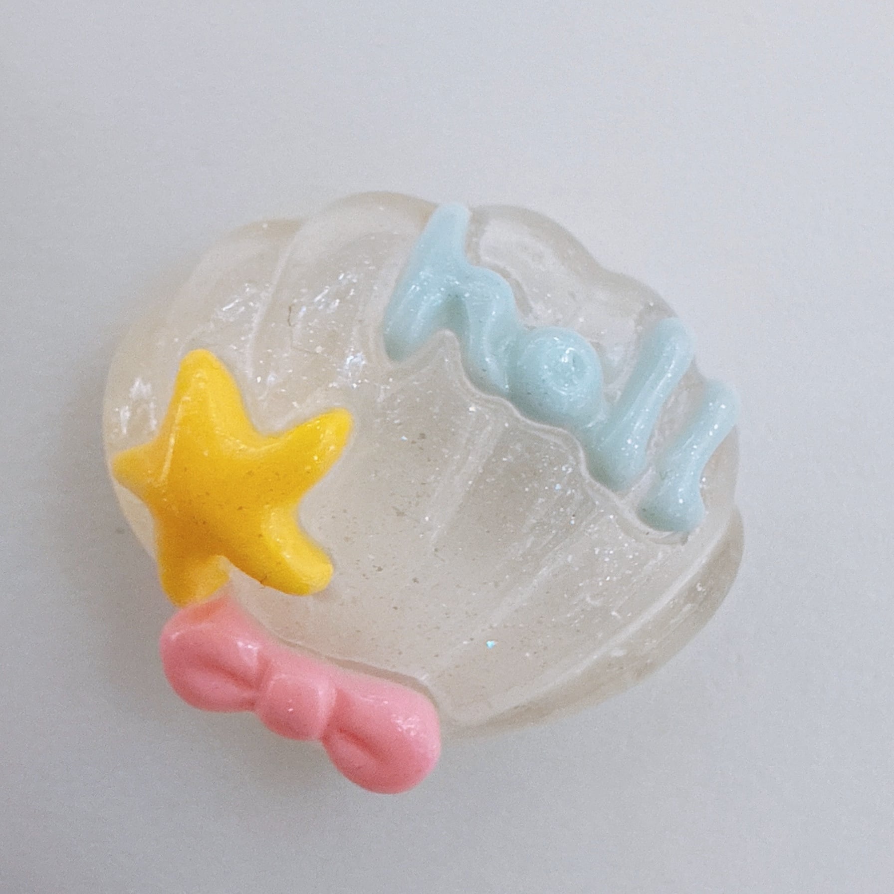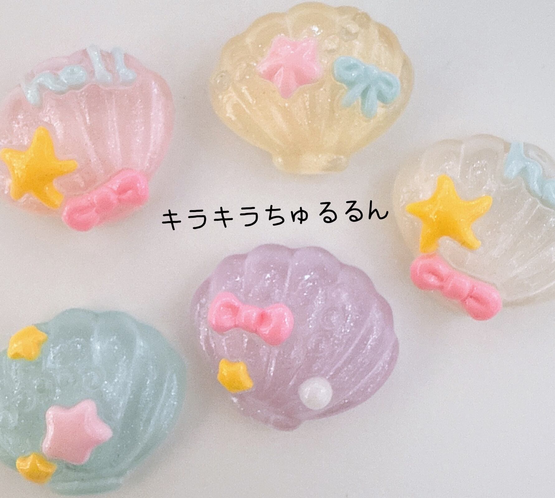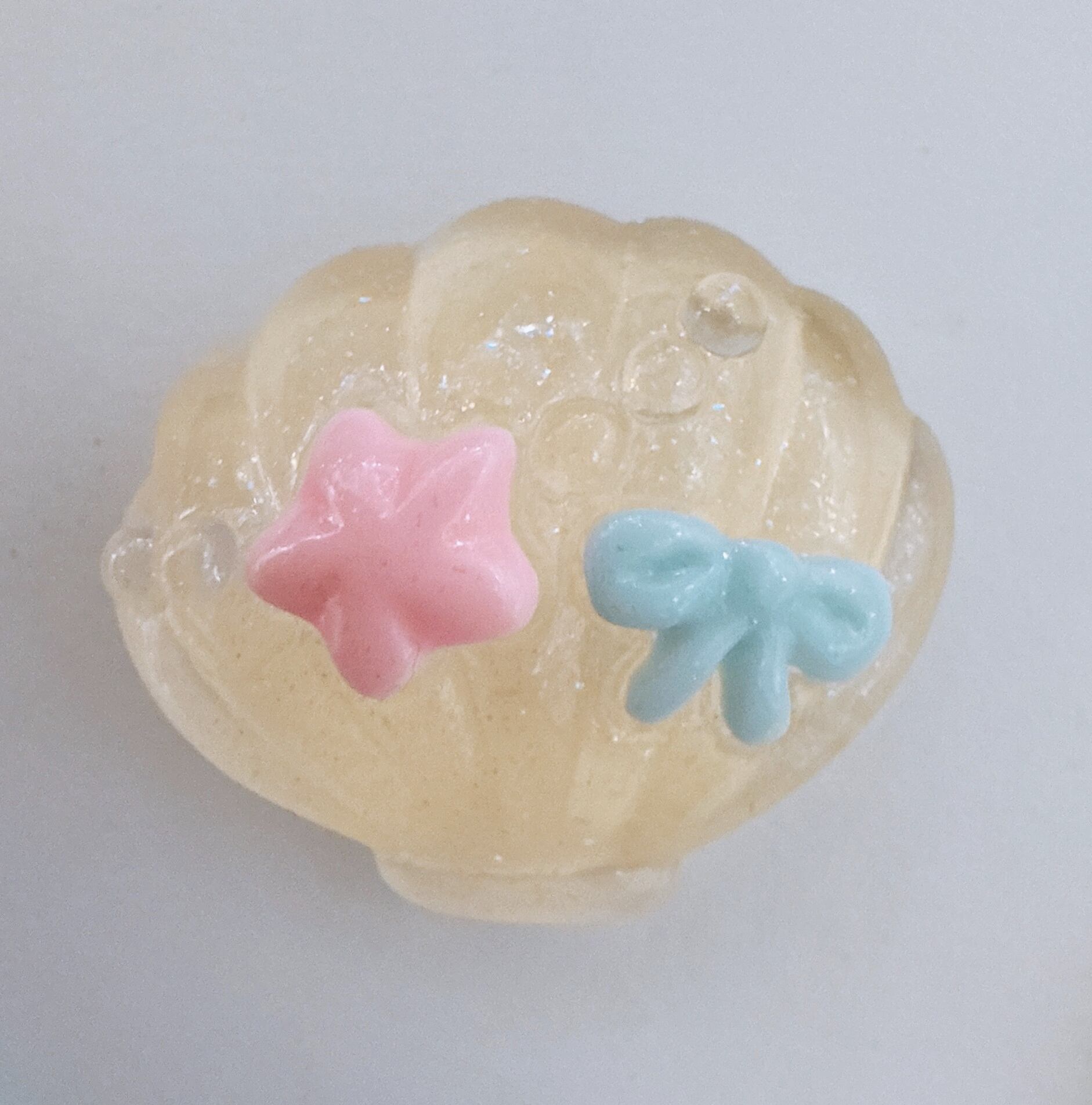 パステルカラーの透明の貝殻の上にリボンや星、パーツが乗っています。