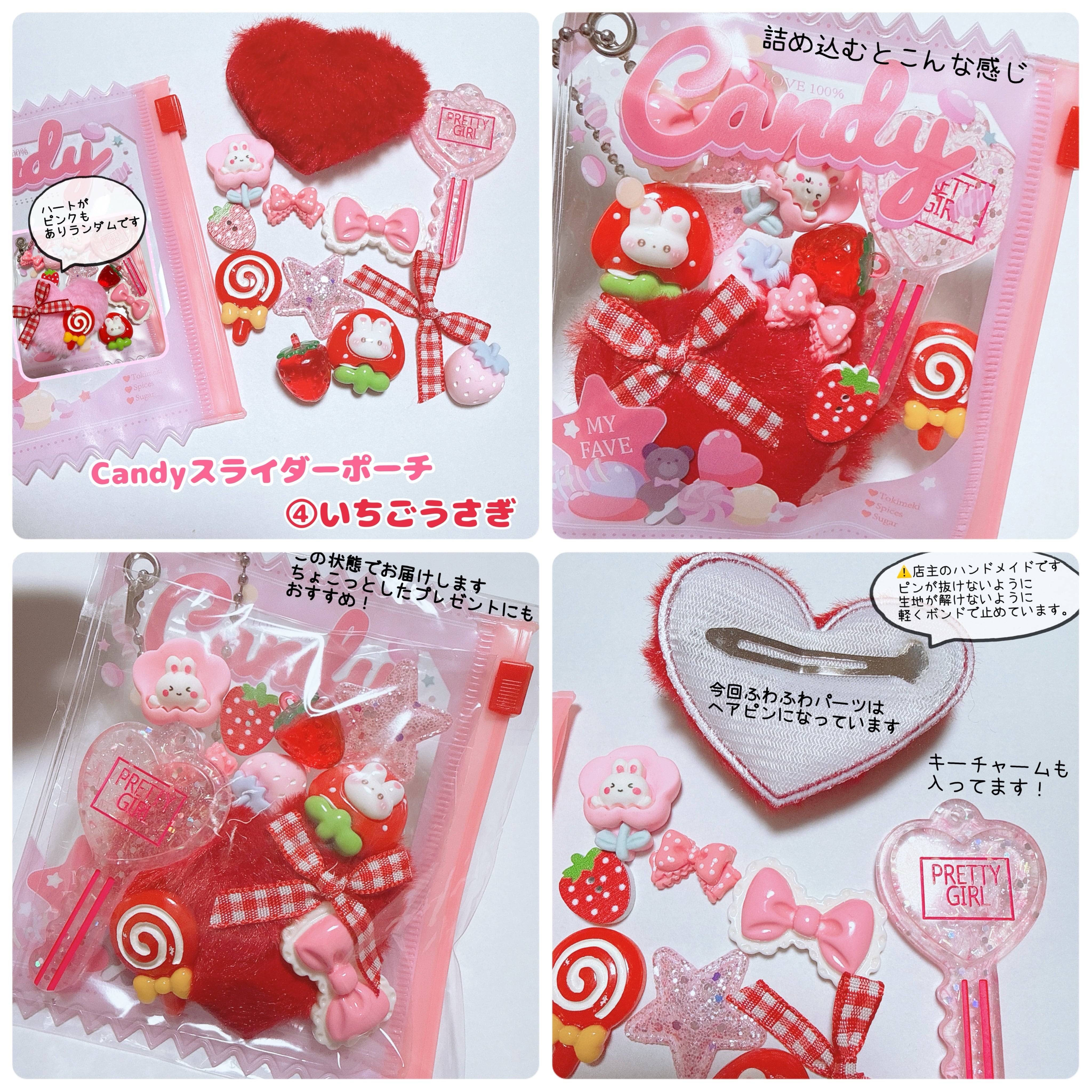 ⚠いちごとうさぎセットはハートヘアピンが赤とピンクのランダムです。ポーチのスライダーも赤とピンクがありランダムです。