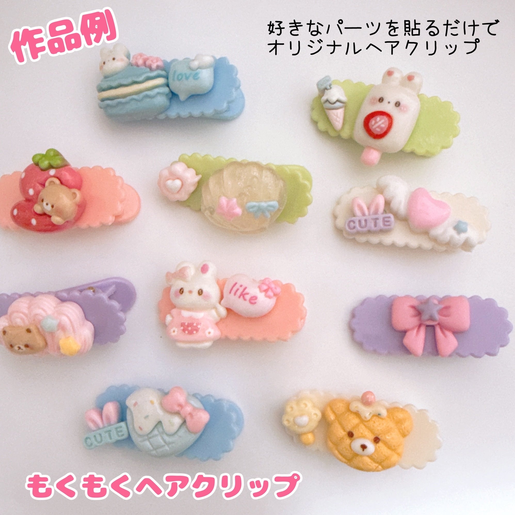 好きなパーツを貼り付けてオリジナルなヘアクリップが作れます。