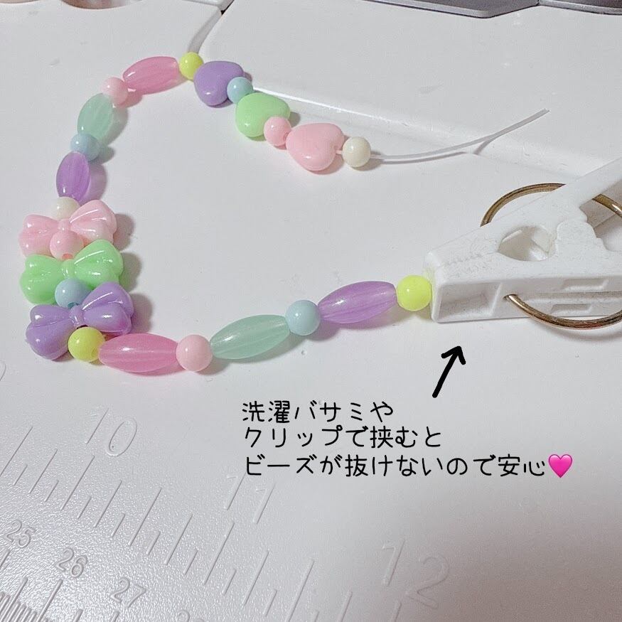 テグスで作成する場合は、ビーズが抜けないように、片方に洗濯ばさみなど挟むと安心。